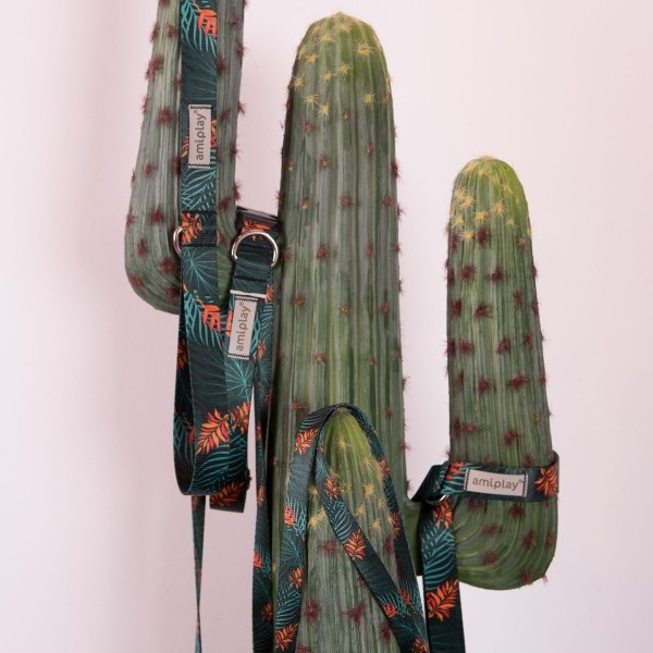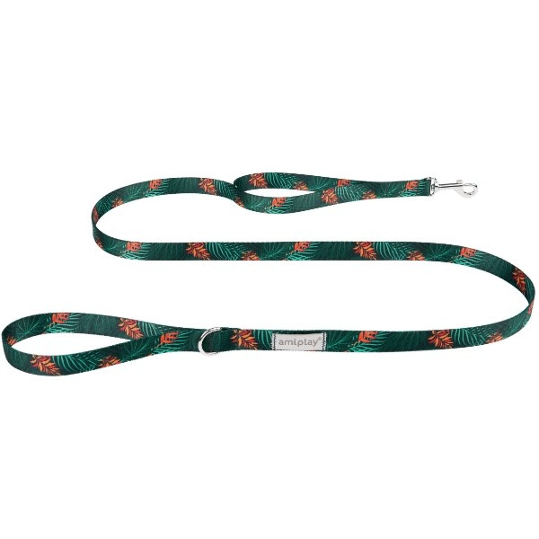 Smycz z serii BeHappy to doskonały wybór na codzienne spacery. Jej długość oraz waga są idealnie dostosowane do psów ras małych. Niewielki karabińczyk oraz taśma o szerokości 1,5 cm nie obciąża psa, co wpływa na komfort spacerów. Smycz wykonana jest z wytrzymałej taśmy, odpornej na warunki atmosferyczne o niezwykle radosnej kolorystyce. Zastosowana taśma jest bardzo łatwa w czyszczeniu, wystarczy przetrzeć ją wilgotną szmatką lub wyprać, gdy zajdzie taka potrzeba i znów jest gotowa do użycia. Wygodna rękojeść zapewnia dużą pewność prowadzenia psa. Przy uchwycie znajduje się oczko służące do wygodnego przypięcia pojemnika na woreczki. Smycz we wzorze Jungle od amiplay ma idealną długość dla zapewniania psu bezpieczeństwa, a opiekunowi wygody. Mocny karabińczyk umożliwia swobodne przypięcie oraz odpięcie smyczy, a ponadto wszyty jest dodatkowy uchwyt w jej dolnej części, który pozwala na szybką reakcję i kontrolowane przytrzymanie psa w każdej sytuacji. Dzięki temu smycz klasyczna z serii BeHappy zapewni jeszcze większy komfort i bezpieczeństwo podczas spacerów.