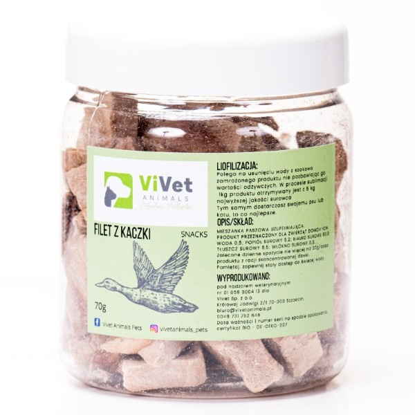 Przysmaki liofilizowane ViVet dla psów i kotów składają się w 100% z liofilizowanego mięsa! Bez żadnych konserwantów. Są zdrowe, pożywne, a przede wszystkim pyszne! Doskonale sprawdzą się jako nagroda, przekąska, urozmaicenie diety czy zachęcająca posypka dla psich niejadków podczas każdego posiłku. Liofilizacja mięsa w przysmakach ViVet polega na usunięciu wody z surowca. Proces ten nie pozbawia mięsa jego wartości odżywczych. 1 kg produktu otrzymywany jest z 5 kg surowca. Filety z kaczki zawładną podniebieniem każdego psiego lub kociego smakosza i zagoszczą w jego diecie na bardzo długi czas. Sprawdź ofertę liofilizowanych przysmaków i gryzaków ViVet w Megazoologiczny.pl