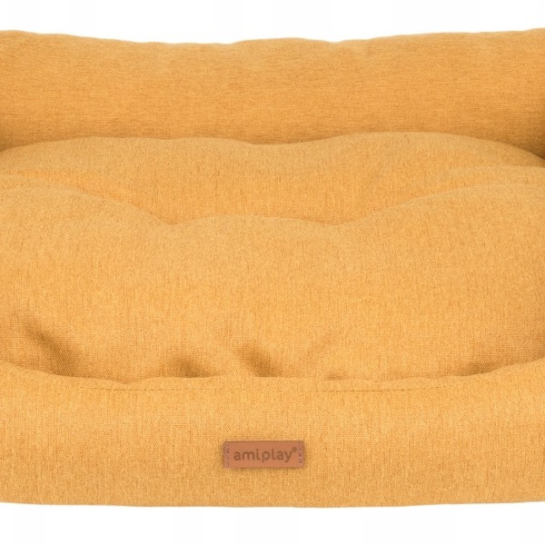 Legowisko Sofa Montana od amiplay w kolorze żółtym / musztardowym świetnie sprawdzi się jako miejsce wypoczynku dla psa. Wykonane jest z bardzo trwałej tkaniny meblowej odpornej na uszkodzenia, wypełnione dużą ilością specjalnej mieszanki puchu syntetycznego i pianki, odpornego na odkształcenia, dzięki czemu będzie służyło psu przez długi czas. Poduszkę można wyprać w pralce lub ręcznie dzięki, czemu czyszczenie i odświeżenie legowiska jest bardzo łatwe. Legowisko cechuje się dużą powierzchnią wypoczynkową, w stosunku do wymiarów zewnętrznych, dzięki czemu przypadnie do gustu każdemu psu dając mu duże poczucie komfortu. Dobierając odpowiedni rozmiar legowiska warto zmierzyć powierzchnię, jaką zajmuje śpiący pies. Legowisko powinno pozwolić psu na obracanie się i ułożenie w wygodnej pozycji. Będzie ono doskonałą strefą odpoczynku, a ustawione w odpowiednim miejscu stanie się dla psa azylem, w którym będzie czuł się bezpiecznie.