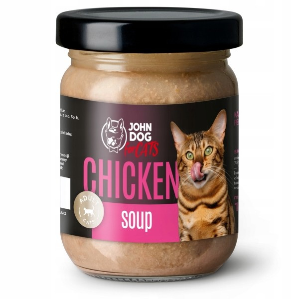 Pyszna, pełnoporcjowa karma w formie zupy dla dorosłych kotów od John Dog for Cats. Produkt opracowany we współpracy z dietetykiem. Nie zawiera wzmacniaczy smaku i konserwantów. Zupka dla kotów ma niski poziom węglowodanów. Dodano do niej świeże żółtko jajka kurzego. Produkt w szklanym słoiku. O szczelności zamknięcia świadczy wklęsła nakrętka, która przy otwarciu wydaje charakterystyczny „klik”. Smak John Dog for Cats z kurczakiem na pewno zrecenzuje pusta miska Twojego futrzaka. Mięsko w sosie będzie doskonałym wyborem dla kocich niejadków, które mają problem z regularnym przyswajaniem codziennych posiłków. Sprawdzi się również, jako dodatek do podstawowej diety zwierzaka.