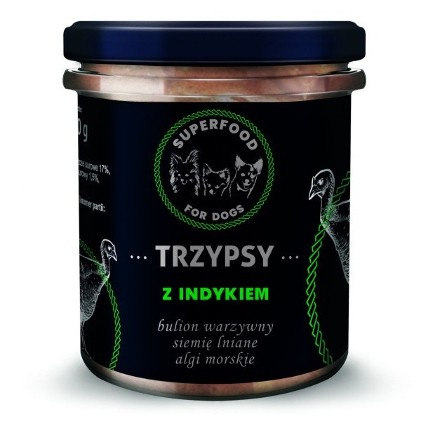 Skład: wieprzowina 57% (płuca wieprzowe 17%, śledziona wieprzowa 15%, wątroba wieprzowa 11%, nerki wieprzowe 7%, skórki wieprzowe 7%), indyk 15% (mięso indycze drobne z uda 10%, wątroba indycza 3%, żołądki indycze 2%,) bulion warzywny, siemię lniane 2%, algi morskie, minerały, ekstrakt ziołowy.
