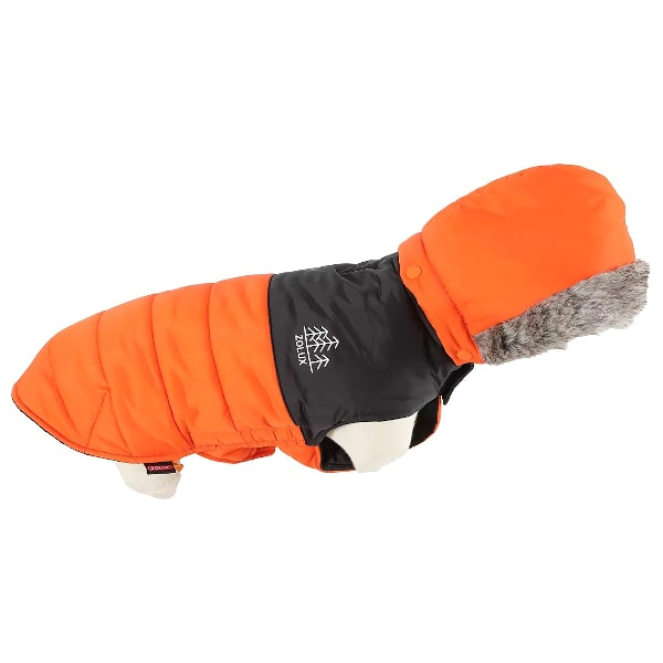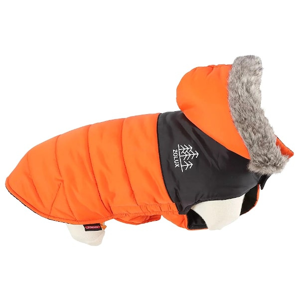 Ubranka dla psów z serii Mountain to puchowe kurtki w czterech kolorach (szary, khaki, pomarańczowy i czerwony). Ubranka są pikowane, co sprawia, że lepiej przylegają do ciała zwierzęcia, zapewniając dobrą izolację cieplną. Kurki posiadają miękkie od środka kaptury, które w razie potrzeby możemy w szybki sposób wypiąć z zatrzasków. Płaszczyki są regulowane przy kołnierzu (rzepy) i na klatce piersiowej (rzepy i pas z gumką w środku). Dopasowany kolorystycznie otwór na smycz ułatwi przypięcie psa bez konieczności przełożenia sprzętu spacerowego na wierzch ubranek. Kolejnym wielkim plusem Mountain jest fakt, że użyty w nich nylon i poliester pochodzą z recyklingu. Firma Zolux chcąc zadbać o środowisko zamieniła część materiałów użytych do produkcji i ekspozycji swoich produktów, na takie które pochodzą z recyklingu.