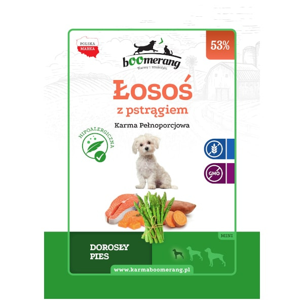 Karma bOOmerang łosoś z pstrągiem dla psów dorosłych małych ras, to pełnoporcjowa sucha karma z dwoma bardzo wartościowymi źródłami białka. Ryby w diecie psa dostarczają szereg pożytecznych dla zdrowia psa substancji, m.in. kwasy wielonienasycone (omega-3, DHA i EPA), jod wpływający na prawidłową pracę tarczycy, selen który zapewnia dobrą pracę układu krwionośnego i odpornościowego, witaminę D wpływającą na przyswajanie wapnia i fosforu, magnez regulujący pracę serca, wapń mający działanie przeciwzapalne oraz przeciwalergiczne. Dodatkowo ryby to łatwo przyswajalne białko, które najrzadziej uczula psy.