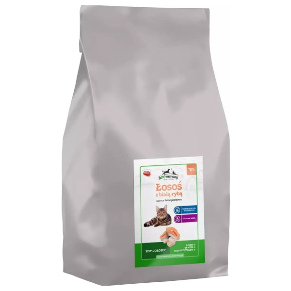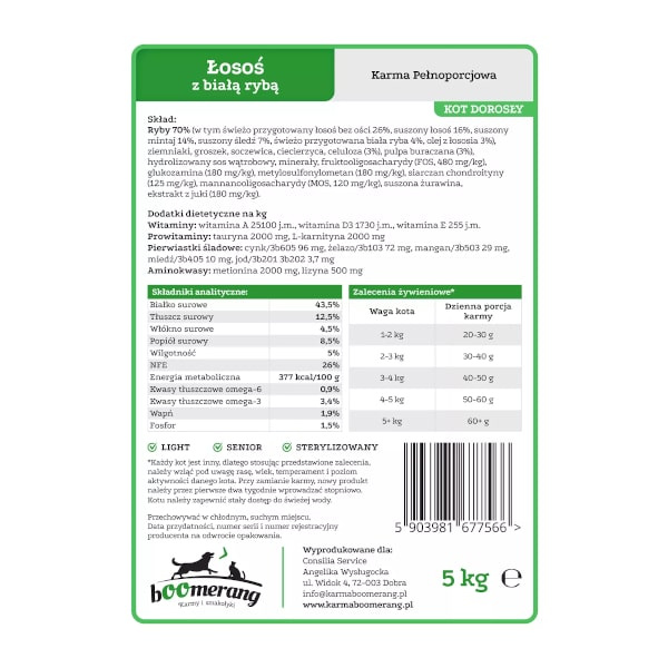 Karma bOOmerang łosoś z białą rybą dla kotów wszystkich ras, to pełnoporcjowa sucha karma będąca dobrą opcją dla kotów seniorów, czy po kastracji. Zawarte w składzie ryby bogate są w kwasy tłuszczowe Omega-3, które mają wpływ na m.in. skórę, sierść, przyswajanie składników odżywczych, czy trawienie pupila. Oprócz Omega-3 ryby są dobrym źródłem EPA i DHA, odpowiedzialnych za odporność, pracę układu nerwowego, a nawet DHA potrzebny jest do prawidłowego rozwoju siatkówki oka kota. Kolejnym wartym uwagi składnikiem karmy bOOmerang łosoś z białą rybą jest