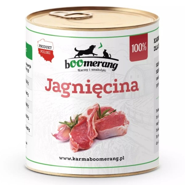 Karma bOOmerang z jagnięciną dla psów wszystkich ras. 100% mięsa z mięśni i podrobów w smakowitej galaretce. Posiłek dla psów bogaty w witaminy i minerały niezbędne do prawidłowego funkcjonowania organizmu. Bez wypełniaczy, sztucznych barwników, substancji zapachowych i konserwantów. Receptury tego polskiego produktu są proste, pożywne i nie zawierają żadnych ukrytych składników. Zawiera tylko jedno źródło pełnowartościowego białka.