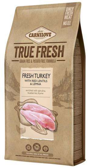 Carnilove Dog True Fresh Turkey to receptura bez zbóż i ziemniaków, oparta wyłącznie na świeżym mięsie, dla dorosłych psów wszystkich ras. 100% smacznej suchej karmy o doskonałej przyswajalności. Produkowana wyłącznie ze świeżego mięsa dla lepszego trawienia oraz zdrowej skóry i sierści. Wzbogacona o witaminę C i taurynę - wzmocnienie odporności oraz właściwości antyoksydacyjne. Wzbogacona o rzęsy wodne (Lemna L.) - źródło kwasów tłuszczowych. Każdy kilogram karmy jest przygotowany z 600 g świeżego mięsa: 60% świeżego mięsa oraz 40% warzyw, owoców, ziół, superfood.
