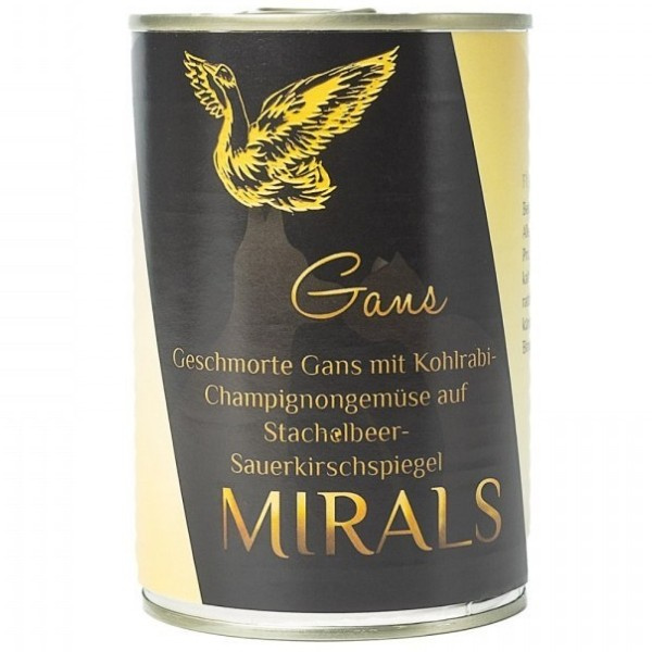 To karma o wysokiej zawartości mięsa mięśniowego z gęsi (50%) i wartościowych serc ( 5% ), z dodatkiem świeżych warzyw, owoców, ziół i dodatków superfood.Mięso gęsi obfituje w kwasy tłuszczowe Omega-3 i Omega-6. Zawiera wszystkie niezbędne aminokwasy egzogenne. Bogata jest także w witaminy: A, E oraz witaminy z gr B. Wątroba z gęsi to jeden z cenniejszych organów. Zawiera szereg mikro- i makroelementów oraz witamin, w tym naturalnej witaminy A oraz witamin z grupy B. Karma monobiałkowa, w której składniki odżywcze, witaminy i minerały pochodzą wyłącznie z naturalnych składników, dzięki czemu cechują ją wysoką biodostępność i przyswajalność. Karma jest optymalnym zamiennikiem diety B.A.R.F. Szczególnie polecana dla psów z alergiami i o wrażliwym układzie pokarmowym. Karmy Mirals nie zawierają szeregu dodatków dietetycznych, co związane jest z filozofią żywienia ich twórców. Składniki odżywcze, witaminy i minerały pochodzą z naturalnych składników, z których stworzona jest karma, takich jak mięso, organy oraz świeże warzywa, owoce oraz zioła. Dostarczają one pełnowartościowego białka zwierzęcego, ponieważ bogate są w mięso mięśniowe. Oprócz tego w ich składzie znajdują się niezwykle cenne organy takie jak wątroba i serca, które są źródłem cennych składników odżywczych m.in. witaminy A, żelaza, magnezu oraz witamin z gr B. Wyselekcjonowane składniki mięsne dopełniają świeże warzywa, owoce oraz zioła, dostarczając mikro- i makroelementów oraz błonnika, regulującego prawidłowe trawienie. Każda z karm zawiera tylko jeden rodzaj białka zwierzęcego. Wszystkie te cechy sprawiają, że karmę Mirals można stosować zarówno jako urozmaicenie codziennej diety, ale także może ona stanowić kompletną dietę psa.