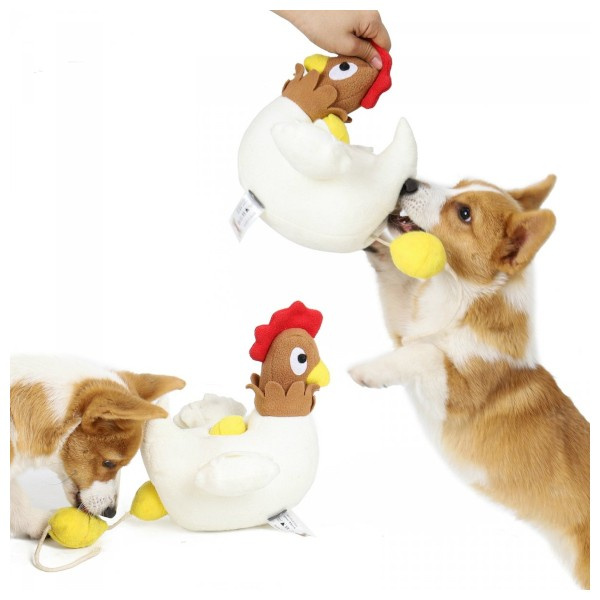 Zabawka Kura marki Doglemi Pet Products to niezwykle urocza rzecz, która dostarczy Twojemu psu wielu wrażeń. To także świetna zabawka węchowa, która sprawi, że Twój pupil się zmęczy, ale bardzo pozytywnie. Węszenie jest dla psa polecaną formą aktywności. Psiak to przede wszystkim nos, więc dając mu Kurę zapewnisz mu cudowna zabawę. Wystarczy ukryć malutkie kawałki smaczków w różnych skrytkach na całej zabawce i zobaczyć, co się będzie działo. Ale najzabawniejsze są jajka na sznurku, które pies ma za zadanie wyciągnąć z kury. Każde jajko ma skrytkę na przysmak, więc psiak z pewnością będzie zmotywowany do ciągnięcia za sznurek i dostanie się do pyszności. Zabawka wykonana jest z miękkiego i przyjemnego w dotyku polaru, do tego można prać w pralce. Pamiętaj, że to nie jest zabawka do gryzienia. Nadzoruj swojego zwierzaka podczas używania i po zakończeniu zabawy zabierz zabawkę węchową.