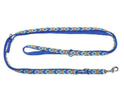 Elegancka smycz dla psa wykonana z taśmy polipropylenowej, zdobiona barwnym "indiańskim" haftem.