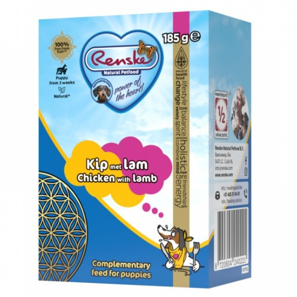 To uzupełniający posiłek dla młodych i dorosłych psów wszystkich ras, od 9 tygodnia. Karma zawiera świeżego kurczaka (53%) z jagnięciną (17%), uzupełniona pysznymi warzywami. W 100% naturalna z dodatkiem witamin i minerałów. Posiłek ten został specjalnie zaprojektowany do nauki jedzenia szczeniąt w pierwszych tygodniach życia. Od 9 tygodnia życia szczenię może jeść już odmiany karm Renske dla dorosłych psów. Radzimy zapewnienie szczenięciu wielu wersji smakowych. Świeże składniki najwyższej jakości użyte do produkcji sprawiają, że to lekkostrawny posiłek o wysokiej smakowitości i delikatnej konsystencji. Zadowoli najbardziej wybrednych psich smakoszy! Zapakowany w ekologiczny, wytrzymały kartonik Tetra Recart®, który sprawdzi się także idealnie w czasie podróży i na wakacjach.