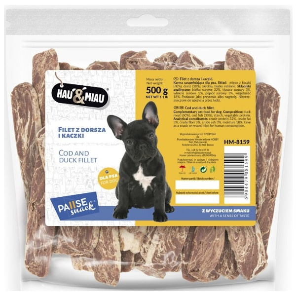 Pause Snack to seria pyszny przekąsek dla psa od Hau&Miau. Paski z dorsza i kaczki to połączenie pysznej kaczki z aromatycznym dorszem. Mięso z kaczki bogate jest w niezbędne do prawidłowego funkcjonowania białko, fosfor, żelazo, witaminy z grupy A, B i E, które min. dbają o zdrowie oczu, skóry, wspierają układ odpornościowy oraz odgrywają istotną rolę w budowie komórek i ich regeneracji. Dorsz natomiast jest mięsem rybim wolnym od tiaminazy, zawiera witaminy A, D, E i z grupy B. Wszystkie te witaminy wpływają na poprawne funkcjonowanie organizmu psa. Przy psich niejadkach dorsz w przysmaku będzie dobrą zachętą do jego zjedzenia. Przysmak wyprodukowany przy pomocy nowoczesnych metod pozwalających zachować jak najwięcej wartości odżywczych, naturalny smak i zapach. Pożywne kęsy są idealne do uzupełniania codziennej diety, sprawdzają się podczas treningów i stanowią doskonałą zabawę. Do tego zaspokajają naturalną potrzebę gryzienia u psów.
