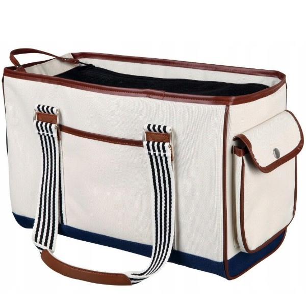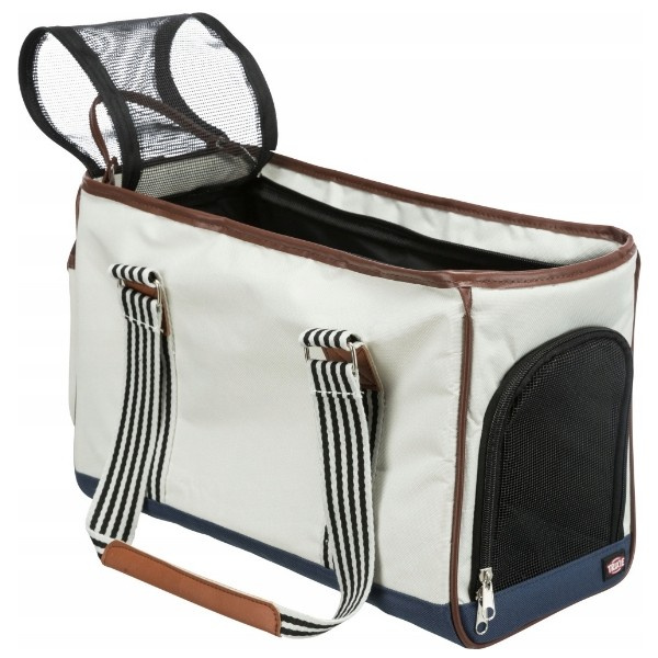 Trixie Elisa to torba, nosidło dla małego psa lub kota. Torba w stylu BOHO, plażowym. Idealny model na letnie wakacje nad polskim lub zagranicznym morzem. Obicie wykonane z poliestru. Zamykana na zamek od góry lub od przodu, gdzie również umieszczone zostały zabezpieczające siateczki. Siatka chroni przed wyskoczeniem i zapewnia odpowiednią cyrkulację powietrza. Siateczki mogą być całkowicie zakryte dla ochrony zwierzęcia. Spód torby jest usztywniany. W środku znajduje się krótka smycz, która zapobiegnie wyskoczeniu psa z torby. Torba sprawdzi się idealnie na spacerach z psem lub wizycie u weterynarza.