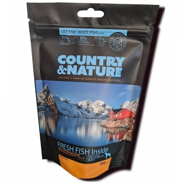 Karma oparta na rybach morskich – białych oraz łososiach. Duża zawartość białka rybiego zapewnia wysoki udział nienasyconych kwasów tłuszczowych Omega 3 i 6 w odpowiednich proporcjach. Znikoma ilość innych białek zwierzęcych zmniejsza potencjał alergizujący karmy, a dzięki bezzbożowej recepturze jest od doskonała dla psów z wrażliwym układem pokarmowym i nietolerancjami. Naturalne składniki o wysokiej jakości dostarczają niezbędnych minerałów, witamin i przeciwutleniaczy. Nienasycone kwasy tłuszcze z ryb oraz oleju z łososia odpowiadają za mocną odporność organizmu, wzmacniają układ krwionośny, nerwowy i kostno-szkieletowy. Jod pochodzący z ryb obecnie jest niezwykle istotny dla prawidłowej pracy tarczycy. Zioła w karmie wspierają trawienie, a cykoria i Juka Schidigera niwelują nieprzyjemne zapachy kału. Wszystkie karmy Country&Nature zawierają L-karnitynę. L-karnityna naturalnego pochodzenia umożliwia wzrost wydajności organizmu zwierząt, zwiększa siłę motoryczną mięśni, wpływa na sprawność mięśnia sercowego oraz stymuluje przemianę materii, zapobiegając nadwadze.