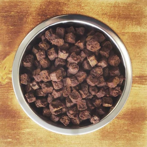 Skład: kaczka 26% (mięso, serca, wątroba, żołądki), wołowina 26% (mięso, serca, żołądki), kurczak 18% (mięso, serca, wątroba), wieprzowina 10% (mięso, płuca, nerki), tłuszcz z kurczaka, jaja, skrobia grochowa, bataty, marchew, substancje mineralne, celuloza sproszkowana, banan, jabłko, szpinak, borówki, maliny, nasiona babki płesznik, pomarańcze, groszek, drożdże piwne suszone (zawierające prebiotyki: mannanooligosacharydy i β-glukany), lecytyna, inulina z cykorii (prebiotyk), jagody goji, siemię lniane, jukka Mojave, wodorosty morskie, omułek nowozelandzki zielonowargowy, glukozamina, siarczan chondroityny, rozmaryn suszony 0,02%.