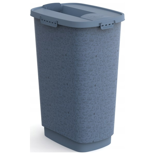 Średniej wielkości, funkcjonalny pojemnik Rotho do przechowywania karmy dla Twojego pupila. Pokrywa wyposażona została w uszczelkę oraz cztery zatrzaski, które zapewnią szczelność i ochronę przed wydostawaniem się niepożądanych zapachów. Dodatkowo szczelne zamknięcie uniemożliwia zwierzęciu dostanie się do środka. Pokrywa jest wyposażona w otwierany dozownik ułatwiający odmierzanie potrzebnych ilości karmy. Praktyczne uchwyty na pokrywie oraz od spodu pojemnika ułatwią dozowanie nawet wtedy gdy pojemnik będzie wypełniony po brzegi. Można również dozować karmę bezpośrednio z pojemnika za pomocą dołączonej do zestawu łopatki. Drukowane motywy w technologi IML są zintegrowane z tworzywem sztucznym, dzięki czemu przedstawiony motyw nie wyblaknie nawet po częstym czyszczeniu.