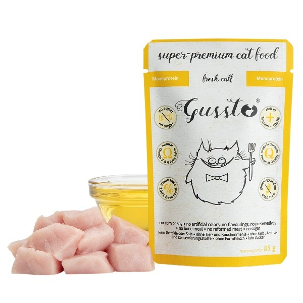 Pełnowartościowa, kompletna i znakomicie zbilansowana karma superpremium dla kotów. Produkowana jest w 100% z najwyższej jakości świeżego mięsa w wysokim standardzie odpowiadającym wymaganiom żywności dla ludzi. Gussto to esencja dobrego i zdrowego żywienia. Zawiera bardzo dużo mięsa idealnie odpowiadając specyficznym wymaganiom pokarmowym kotów. Jest to karma monobiałkowa, a więc holistyczna, lekkostrawna i bardzo dobrze przyswajalna polecana również kotom o wrażliwym przewodzie pokarmowym. Stosowana także w dietach wykluczających przy alergiach pokarmowych. Znakomicie zrównoważony stosunek wapń/fosfor minimalizuje ryzyko chorób układu moczowego i nerek. Dodatkowo karma Gussto zawiera dużo niezbędnych witamin i minerałów jest bardzo bogata w Taurynę i Biotynę, a w jej skład wchodzi dobroczynny olej z ostropestu – bogaty w nienasycone kwasy tłuszczowe, który ma działanie przeciwzapalne, reguluje czynności trawienne i regeneracyjne wątroby, oraz wzmacnia system odpornościowy.