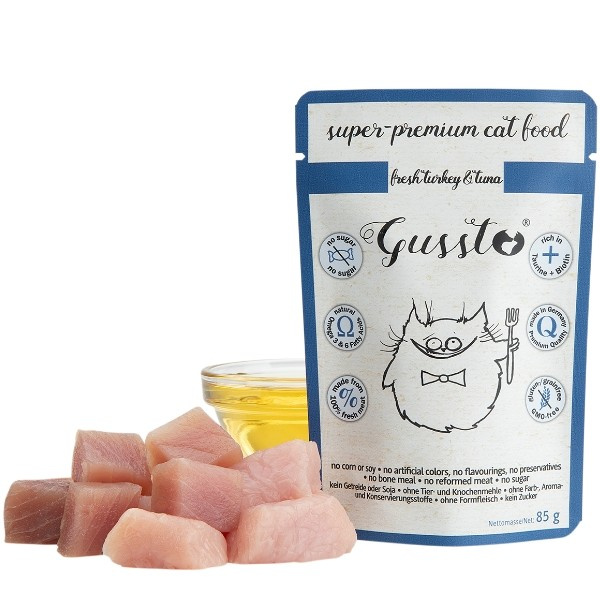 Pełnowartościowa, kompletna i znakomicie zbilansowana karma superpremium dla kotów. Produkowana jest w 100% z najwyższej jakości świeżego mięsa w wysokim standardzie odpowiadającym wymaganiom żywności dla ludzi. Gussto to esencja dobrego i zdrowego żywienia. Zawiera bardzo dużo mięsa idealnie odpowiadając specyficznym wymaganiom pokarmowym kotów. Jest to karma monobiałkowa, a więc holistyczna, lekkostrawna i bardzo dobrze przyswajalna polecana również kotom o wrażliwym przewodzie pokarmowym. Stosowana także w dietach wykluczających przy alergiach pokarmowych. Znakomicie zrównoważony stosunek wapń/fosfor minimalizuje ryzyko chorób układu moczowego i nerek. Dodatkowo karma Gussto zawiera dużo niezbędnych witamin i minerałów jest bardzo bogata w Taurynę i Biotynę, a w jej skład wchodzi dobroczynny olej z ostropestu – bogaty w nienasycone kwasy tłuszczowe, który ma działanie przeciwzapalne, reguluje czynności trawienne i regeneracyjne wątroby, oraz wzmacnia system odpornościowy.