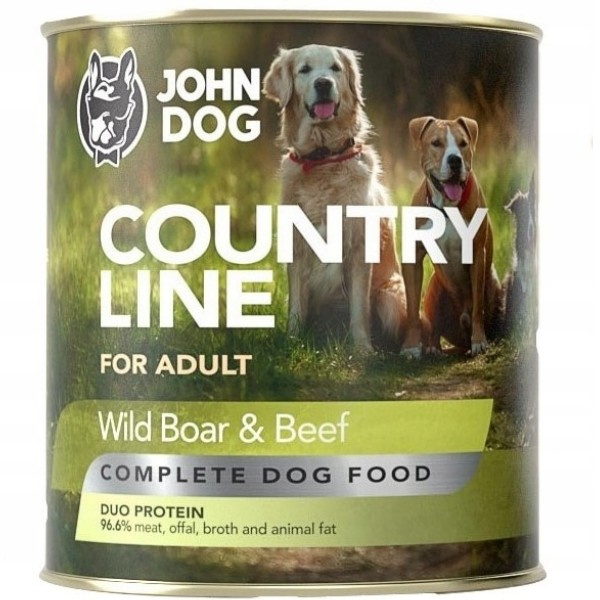 Monoproteinowa, pełnoporcjowa karma dla dorosłych psów wszystkich ras. Bezzbożowa karma z linii Country Line karma mokra na a bazie dwóch rodzajów mięs: dzika i wołowiny. Karma z dodatkiem warzyw i ziół z polskich upraw (ziemniaki, rumianek) oraz innych dodatków np. oleju z łososia czy suszonych drożdży piwnych. Dzięki starannie dobranym dodatkom, cała kompozycja spełnia swoje wspierające funkcje.