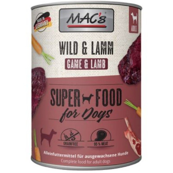 Karma mokra MAC's o wysokiej jakości pożywienie dla psów. Ich przewód pokarmowy przyzwyczajony jest do diety opartej głównie na czystym mięsie. Karma zawierająca zboże często wywołuje nietolerancje pokarmowe u zwierząt. Z tego powodu, posiłki MAC's są całkowicie pozbawione zbóż i soi. Duża zawartość delikatnego mięsa zapewnia wyśmienity smak i wysoką akceptację. W karmie nie występują połączone kawałki mięsne, ani mączka kostna czy zwierzęca, jej wysoką jakość zapewnia najlepsze mięso z serc, wątroby czy płuc. Karma nie zawiera sztucznych barwników, aromatów, oraz konserwantów. Witaminy i minerały ponadto wzbogacają zrównoważoną dietę Twojego psa.