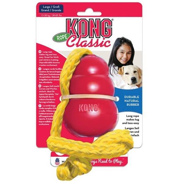 KONG Classic with Rope to gumowa zabawka dla psa z liną, do rzucania na duże odległości. Ten wariant kultowego już KONG Classic jest rekomendowany dla dorosłych psów o umiarkowanej intensywności żucia i będzie odpowiedni dla ras średnich i dużych.KONG Classic pomaga zaspokoić naturalne psie instynkty. Unikalny kształt tej zabawki z trwałego kauczuku sprawia, że jest idealna do gryzienia, a w trakcie zabawy odbija się i podskakuje w nieprzewidywalny sposób. Nylonowa lina umożliwia wygodny rzut i nie musisz dotykać ubrudzonej zabawki. Nylon nie chłonie wody, a na jego powierzchni nie rozwijają się bakterie, które mogą powodować brzydki zapach psich zabawek. Dodatkowo do wnętrza "bałwanka" tak jak w klasycznej wersji KONG, możesz nałożyć smaczki, dla dodatkowej motywacji Twojego pupila.