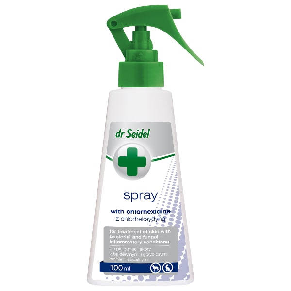 Dr Seidel spray z chlorheksydyną przeznaczony jest do pielęgnacji skóry z bakteryjnymi i grzybiczymi stanami zapalnymi u psów i kotów. Do stosowania w czasie terapii stanów zapalnych wywołanych: zakażeniami bakteriami gram-dodatnimi i gram-ujemnymi, zakażeniami grzybiczymi (w tym drożdżakami), zaburzeniami wywołanymi nadwrażliwością i w dermatozach zależnych od hormonów. Do jego użycia nie trzeba zwierzęcia myć i narażać na niepotrzebny stres. W przypadku bojaźliwych zwierząt, preparat można stosować bezpośrednio na skórę, nie używając atomizera. Nie podrażnia skóry. Spray nie zawiera: barwników i substancji zapachowych.