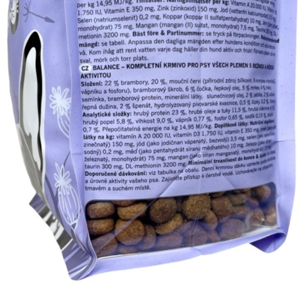 Skład: ziemniaki 22%, Tenebrio Molitor 20% (larwy), skrobia ziemniaczana, soczewica 6%, olej słonecznikowy, marchew 5%, siemię lniane 4%, białko ziemniaczane, drożdże piwne, minerały, jabłka 2%, wysłodki buraczane suszone 2%, szpinak 2%, dzika róża 0,5%, liście lubczyku 0,2%.