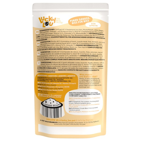 Lucky Lou Lifestage jest karmą pełnoporcjową dla kotów. Nie zawiera zbóż ani cukru. Mokre, wysokiej jakości jedzenie, które przypadnie do gustu kocim smakoszom. arma premium dla kotów, która składa się w ponad 94% z mięsa lub ryb, podrobów i bulionów oraz około 2% węglowodanów roślinnych, 1% składników mineralnych i niewielkiej ilości wysokiej jakości oleju. A ponieważ jest przyjazna kotom, w składzie nie znajdziesz zbóż, glutenu ani dodatku cukrów. Gratka dla fanów prawdziwego smaku!