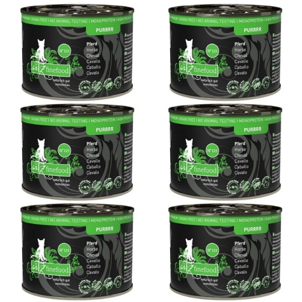 Cała koncepcja żywieniowa Catz Finefood została stworzona aby dopasować się do każdego kota w różnych fazach jego życia. Purrrr to linia pełnoporcjowych karm monoproteinowych dla kotów, która zawiera w swoim składzie 70% mięsa oraz podrobów jednego gatunku. Seria ta szczególnie dedykowana jest kotom z wrażliwym układem trawiennym oraz z alergiami pokarmowymi. Użyte w karmie świeże mięso pochodzi z regionalnych gospodarstw. Konina posiada sporo witamin i minerałów m.in. witaminę B1, witaminę B2, witaminę PP, wapń, fosfor i żelazo. Jest delikatniejsza niż wołowina czy wieprzowina, oraz bardziej wartościowa niż drób.
