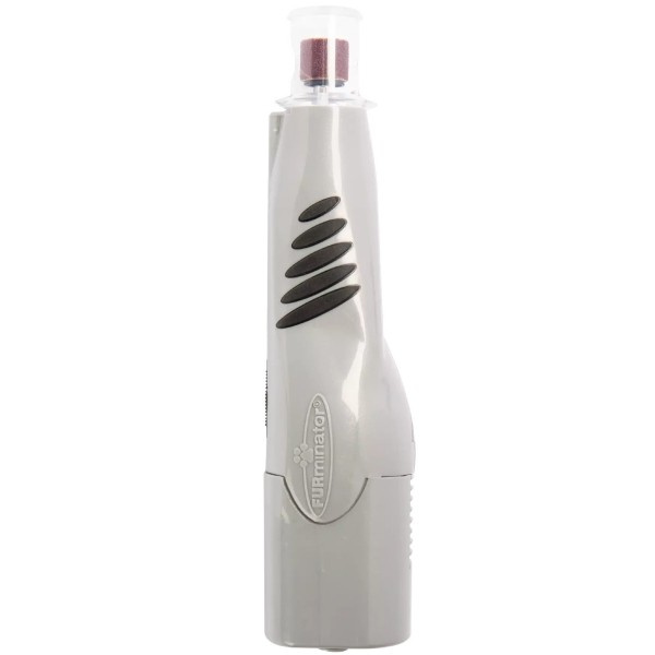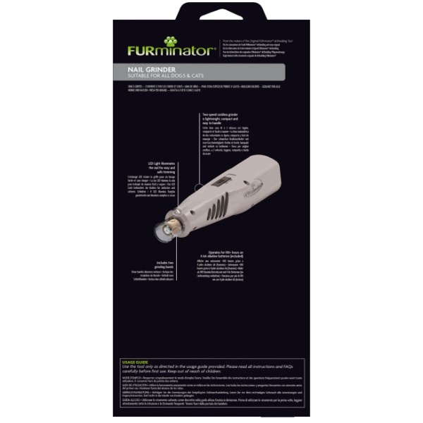 Pilnik do pazurów FURminator Nail Grinder z łatwością piłuje i wygładza pazury. Nadaje się dla wszystkich psów i kotów. Wbudowana lampka LED oświetla pazur, co zapewnia bezpieczne i łatwe piłowanie. Dzięki temu użytkownik kontroluje, czy nie skraca pazura zbyt mocno. Narzędzie jest kompaktowe i lekkie, tym samym łatwe w obsłudze. Jest to pilnik bezprzewodowy o dwóch prędkościach, co ułatwia wybór potrzebnej prędkości. Przyrząd działa przez ponad 100 godzin. Zawiera dwie taśmy szlifierskie. W zestawie 4 baterie alkaliczne AA.