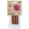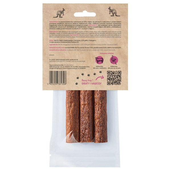 Napsanosy to zdrowe, smaczne, mięsne kabanosy dla psów od Happy Snacky. Wykonane w 100% z mięsa stanowią bardzo smakowitą i naturalną przekąskę w sam raz między posiłkami. Staranna selekcja wybranych mięs i delikatny proces suszenia zapewniają wyjątkową ucztę dla najbardziej wymagających pupili. Idealne dla wszystkich psów, w każdym wieku, ze względu na brak cukrów, składników wabiących, sztucznych dodatków ani wypełniaczy w postaci zbóż. Kabanosy są miękkie, wręcz kruche w środku, z łatwością da się je dzielić na mniejsze kąski. Kabanosy z mięsa mięśniowego kangura to idealna pozycja dla psich alergików i/lub z nietolerancją pokarmową, mięso z kangura odznacza się stosunkowo niskim obciążeniem alergicznym. Opakowanie posiada zamknięcie strunowe zapewniające zabezpieczenie przed powietrzem, w środku znajdują się 3 sztuki pysznych kabanosów. Każdy kabanos ma 14 cm długości i 2 cm średnicy. Przekąskę po otwarciu należy przechowywać w chłodnym i suchym miejscu.