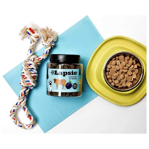 Łapsie to pyszne mini przysmaki trenerskie ze zdrowym i naturalnym składem. Połączenie dużej zawartości mięsa i wyszukanych dodatków zapewni Twojemu pupilowi wyjątkowe doznania smakowe. Przysmaki pieczone są w polskiej manufakturze i nie zawierają zbóż, cukru, barwników ani konserwantów. Dzięki opakowaniu z poręczną zakrętką zachowują zapach i smak na dłużej. Pamiętaj o tym, że przysmaki nie mogą zastąpić codziennej karmy. Nie zapomnij o dostępie do wody dla Twojego zwierzaka.