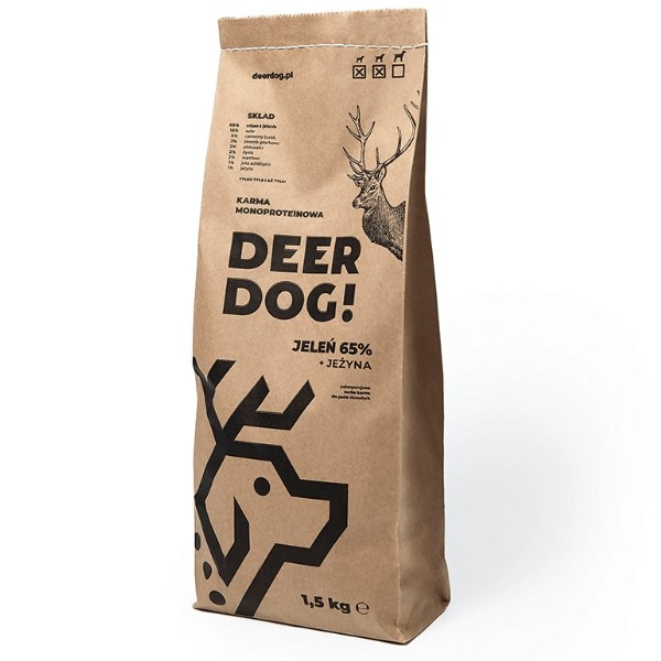 Sucha karma Deer Dog z mięsa jelenia z jeżyną to pełnoporcjowa, monoproteinowa i bezglutenowa karma pieczona dla psów wszystkich ras (małych i średnich). Wyróżnia ją bardzo wysoka zawartość najwyższej jakości mięsa oraz roślin i ziół. Bez dodatku zbóż, innych gatunków mięsa, mączki kostnej, barwników czy konserwantów. Użyte mięso poddane jest starannemu procesowi kontroli jakości i produkcji. Skład skomponowany został w oparciu o wieloletnie doświadczenie i wiedzę na temat potrzeb zdrowotnych zwierząt. Każdy worek zawiera niezbędny zestaw minerałów i witamin dla psów każdej rasy i w każdej fazie życia i rozwoju.