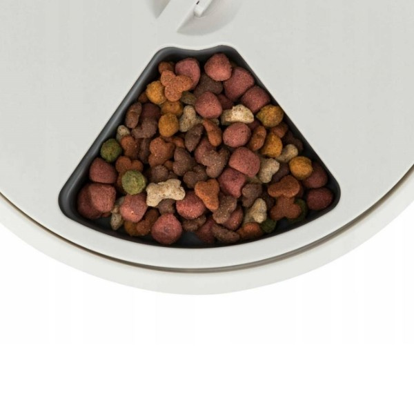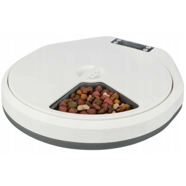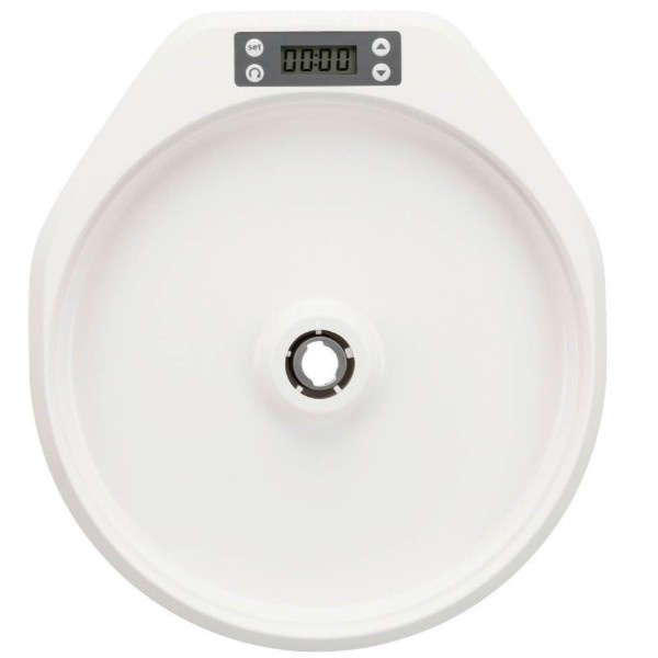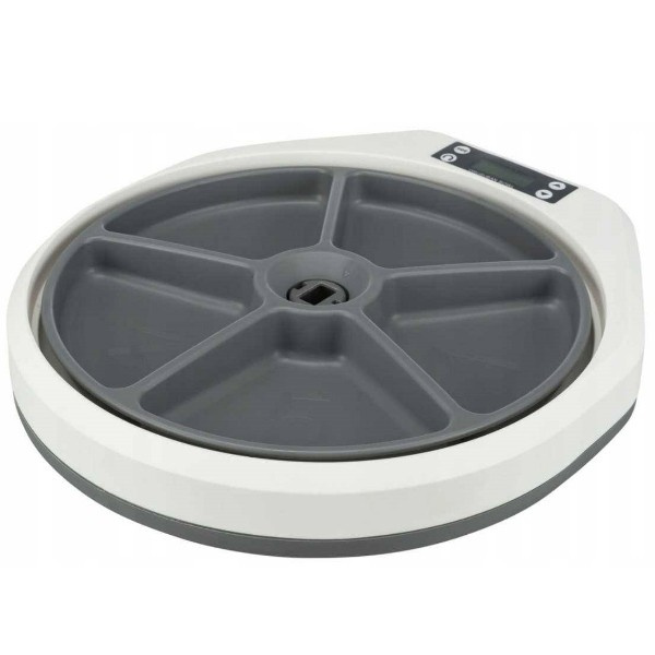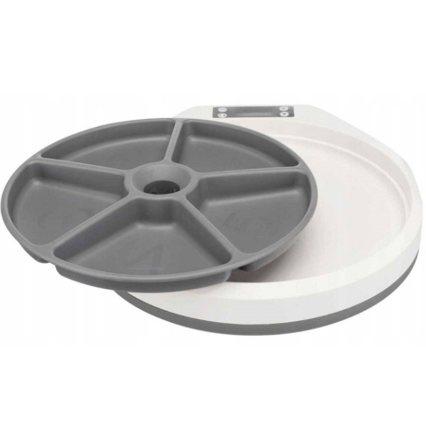Karmidło automatyczne dla Twojego psa lub kota z pewnością ułatwi Ci codzienne karmienie Twojego pupila! Karmidło automatyczne na 5 posiłków (4 + 1) po 0,24 l nadaje się również do mokrej karmy. Miski można myć w zmywarce. Produkt wykonany z plastiku. Na baterie (4 × AA, nie zawiera baterii). Wewnątrz karmidła znajduje się czasomierz do 24 godzin zapewnia automatyczne otwarcie o określonym czasie.