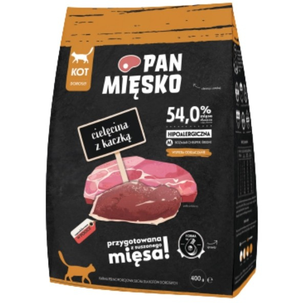 Poznaj hipoalergiczne suche karmy dla kotów Pan Mięsko. Wyróżniają je starannie wyselekcjonowane mięsa z dodatkiem soczystych polskich jabłek, zdrowych warzyw i cennych składników odżywczych, które pozytywnie wpłyną na zdrowie oraz kondycję Twojego kota. Nasze receptury zostały przygotowane przez specjalistów, po to, aby dostarczyć Twojemu czworonożnemu towarzyszowi dokładnie to, czego potrzebuje. Twój kot zasługuje na wszystko, co najlepsze.