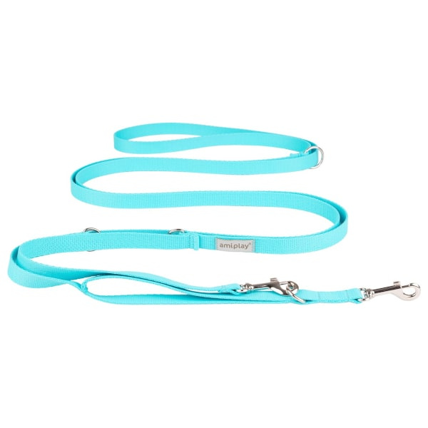 Smycz z serii Samba 8in1 od amiplay to doskonały wybór by wyróżniać się spośród tłumu i dać dużą swobodę psu na smyczy. Wychodząc naprzeciw oczekiwaniom opiekunów, amiplay postawił na komfort i designerską kolorystykę, przywodzącą na myśl niekończącą się feerię letnich barw, rodem z szalonych ulic i plaż Rio de Janeiro. Smycz wykonana jest z miękkiej i wytrzymałej taśmy. Świetnie sprawdza się zarówno u psów dorosłych jak i u szczeniąt w trakcie nauki chodzenia na smyczy. Posiada regulację długości, dzięki której możemy dostosować ją do każdej sytuacji. Smycz na długości minimalnej ma 200 cm. Jeśli chcemy, możemy pozwolić na większą swobodę i przepiąć smycz na długość 230 cm, następnie na 290 cm, natomiast po całkowitym rozpięciu można otrzymać smycz o długości 4 m, co pozwala psu na swobodę i eksploatację terenu bez szarpania opiekuna. Jest to idealne rozwiązanie dla szczeniąt, które są bardzo ciekawe świata, oraz będzie niezastąpiona przy nauce komend na odległość. Jest bardzo łatwa w czyszczeniu, wystarczy przetrzeć ją wilgotną szmatką lub wyprać, gdy zajdzie taka potrzeba i znów jest gotowa do użycia. Wszystkie okucia są bardzo wytrzymałe, wzmocnione obszyciami, tym samym zapewniając bezpieczeństwo podczas mocniejszego szarpnięcia w czasie spaceru.