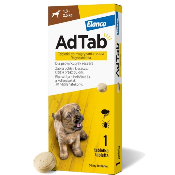 - Zawartość opakowania: 1 tabletka przeciw kleszczom i pchłom AdTab do stosowania od 8 tygodnia życia
