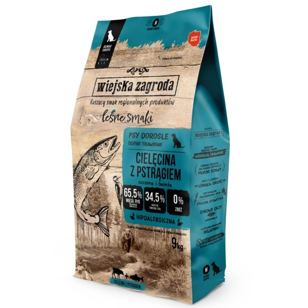 Starannie opracowane przez dietetyków receptury bazują na psich pierwotnych nawykach żywieniowych, oferując psom wszystko to, co w naturze jest dla nich jest najlepsze. Niezwykłe leśne formuły to połączenie regionalnych smaków tj. wołowina, cielęcina i wieprzowina z wyśmienitym jeleniem, dzikiem, czy pstrągiem. To wyjątkowo smakowite połączenie. Regionalne produkty od lokalnych dostawców są gwarancją świeżości i jakości składników! To wyjątkowo zdrowa i smakowita propozycja dla Twojego przyjaciela. Cielęcina charakteryzuje się delikatną konsystencją, a dzięki niskiej zawartości tłuszczu jest wyjątkowo lekkostrawne i zapobiega nadmiernemu przybieraniu na wadze. Jego niezwykłe walory smakowe sprawiają, że będzie doskonałym wyborem nawet dla psich niejadków! To również bogate źródło witamin i minerałów! Pstrąg to cenne źródło wysokiej jakości białka. Jest bogaty w kwasy Omega-3 odpowiedzialne za zdrowy wzrok, dobrą kondycję sierści i skóry oraz korzystnie wpływają na zdrowie całego organizmu. Karma cielęcina z pstrągiem szczególnie wspiera dobre trawienie, dzięki zawartości wartościowego RUMIANKU! Jej średnie chrupki będą idealne zarówno dla mniejszych i większych psiaków!
