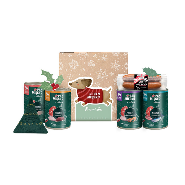 Kto był dobrym pieskiem w tym roku? No kto? Twój piesek! Co wytropi tym razem pod choinką? Piękne świąteczne pudełko, które możesz podpisać imieniem swojego najlepszego przyjaciela. A w środku świąteczna zabawka i same rarytasy: najnowsze menu Pana Mięsko! Wykwintne pasztety z ziołami – aż cztery smaki do wypróbowania. I jeszcze deser, któremu się nie oprze. Hot Dogi z Bekonem!