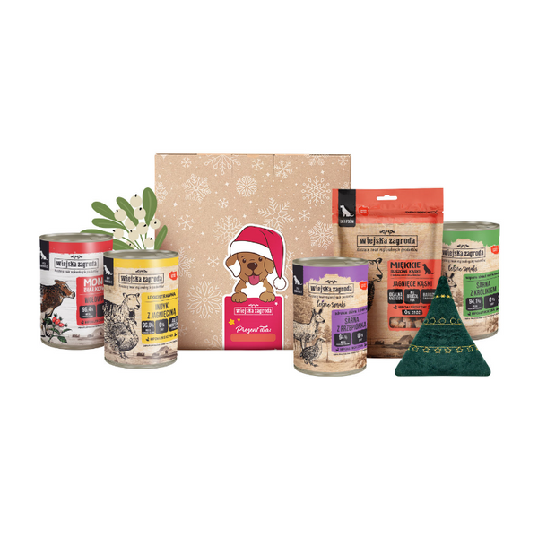 Pełen pyszności zestaw prezentowy Wiejska Zagroda to idealny sposób, aby pokazać mu jak bardzo go kochasz! W zestawie znajdziesz najwyższej jakości bezzbożowe karmy mokre Wiejska Zagroda oraz nowość – pyszne, miękkie przysmaki. Całość idealnie dopełnia piszcząca pluszowa zabawka w kształcie świątecznej choinki. W sam raz na prezent dla każdego grzecznego psiaka! Stylowy karton ze świątecznym motywem i miejscem na wpisanie imienia Twojego Pupila idealnie sprawdzi się jako gotowy prezent na Mikołaja czy pod choinkę.