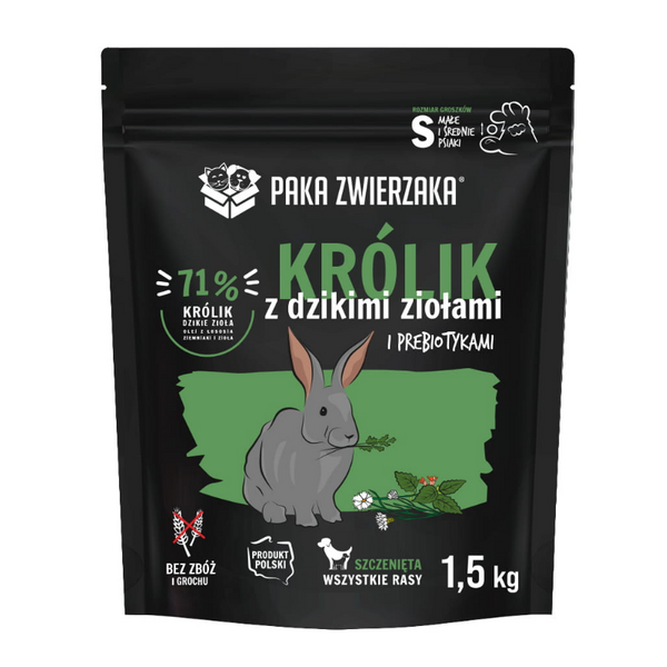 Królik i dzikie zioła 41% (w tym suszone mięso królika 32%, zioła 9% - siemię lniane, ostropest, dzika róża, cykoria, pokrzywa, szpinak), ziemniaki 20%, skrobia ziemniaczana, olej z łososia 10%, wysłodki buraczane, suszone drożdże piwne, jabłko 4%, minerały i witaminy, pietruszka, MOS, glukozamina, chondroityna. |