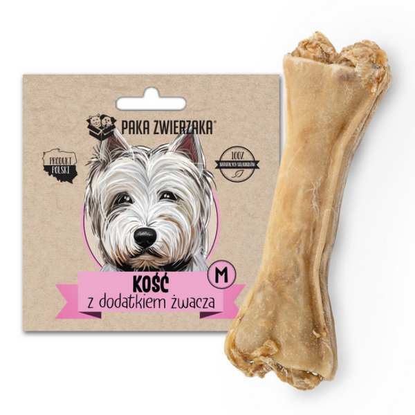 Kość wykonana ręcznie, pozbawiona klejów i barwników. Stworzona tylko z naturalnych składników najwyższej jakości. Bezpieczna dla dziąseł psa, nie zawiera ostrych elementów.
