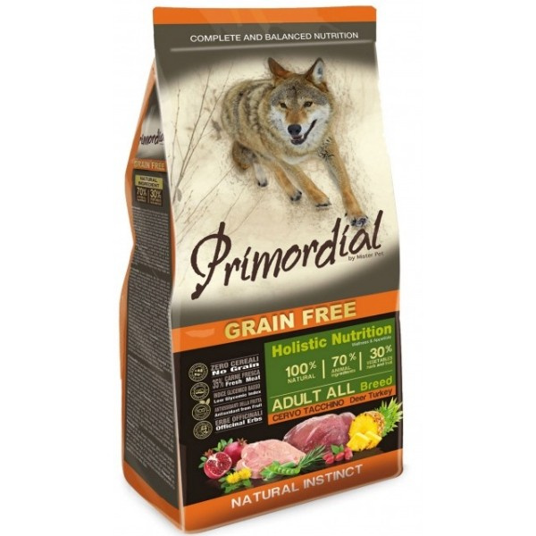 Primordial to linia karm całkowicie bezzbożowych, która na nowo odkrywa i szanuje najbardziej pierwotny i naturalny instynkt żywieniowy psów. Będąc anatomicznymi mięsożercami, o czym świadczy ich żucie (zęby i szczęki) oraz krótki przewód pokarmowy, psy preferują dietę bogatą w mięso (białka) i ubogą w zboża (węglowodany). Primordial Grain Free, dzięki braku zbóż, 70% składników pochodzenia zwierzęcego oraz odpowiedniej mieszance warzyw i owoców, pomaga utrzymać niski indeks glikemiczny. 35% świeżego mięsa lub ryb gwarantuje wysoką smakowitość i strawność. Gotowanie na parze pozwala zachować integralność protein, dzięki czemu są one łatwo przyswajalne.