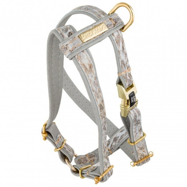 Ich unikalny wzór w cętki oraz cieniowana panterka nadają im wyjątkowego charakteru, a złote okucia z mosiądzu dodają elegancji i sprawiają, że szelki prezentują się bardzo luksusowo. Dodatkowo, szary kolor sprawia, że będą pasować do wielu innych akcesoriów dla psa.