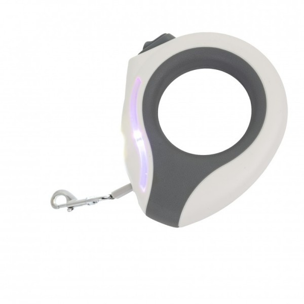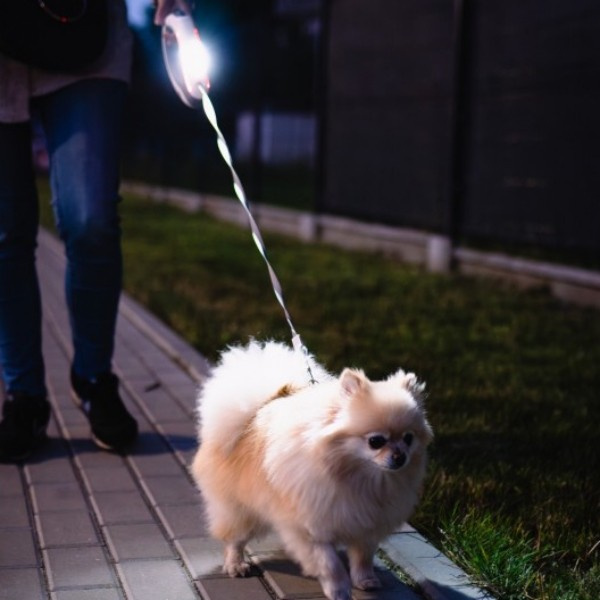 Aby korzystać ze smyczy, wystarczy przypiąć karabińczyk do obroży psa i wyregulować długość taśmy, aby zapewnić mu odpowiednią swobodę ruchu. Dzięki przyciskowi blokady, można szybko i łatwo zatrzymać psa w dowolnym momencie. Wbudowana latarka LED jest szczególnie przydatna podczas spacerów po zmroku – wystarczy nacisnąć przycisk, aby ją włączyć, zapewniając sobie lepszą widoczność w ciemności. Regularne ładowanie smyczy za pomocą dołączonego kabla USB typu C gwarantuje jej gotowość do użycia w każdej chwili.