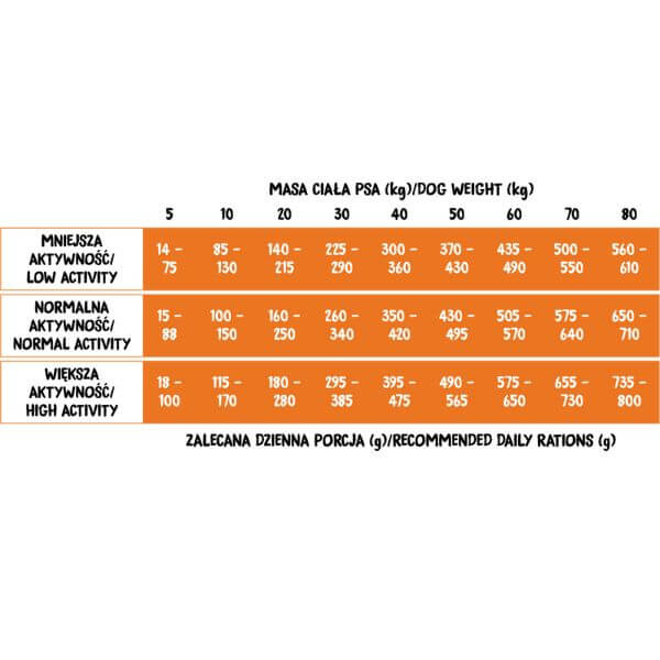 Podane w tabeli dzienne zapotrzebowanie jest orientacyjne. Każdy pies jest inny i ma różne potrzeby. Obserwuj swojego zwierzaka i zwiększ lub zmniejsz porcję dzienną karmy w razie potrzeby. Pamiętaj, aby zapewnić mu stały dostęp do świeżej wody! Przechowuj karmę w chłodnym i suchym miejscu. Pamiętaj o dokładnym zamknięciu opakowania po każdym karmieniu.