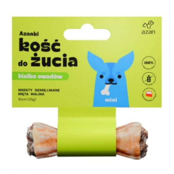 Azanki Kość do żucia Mini z insektami, siemieniem lnianym, miętą i maliną to wyśmienity przysmak dla dorosłych psów miniaturowych i małych ras, zaspokajający ich naturalną potrzebę gryzienia i żucia. Kości nie zawierają ostrych i kruchych elementów, stanowiąc bezpieczniejszą alternatywę dla rozmaitych gryzaków.