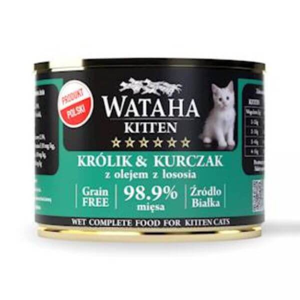 Mokra karma Wataha Hunt Królik i Kurczak dla kociąt różnych ras. Karma z wysoką zawartością mięsa króliczego i drobiowego, z dodatkiem oleju z łososia. Forma miękkiego pasztetu jest niezwykle delikatna, ułatwia zjadanie posiłków. Karma charakteryzuje się wysoką wilgotnością, dzięki czemu może stanowić dodatkowe źródło nawodnienia. Produkt powstał w zgodzie z naturą i z myślą o kocich potrzebach żywieniowych. Sprawdzi się w diecie wrażliwych kotów, które przepadają za mięsnym aromatem.