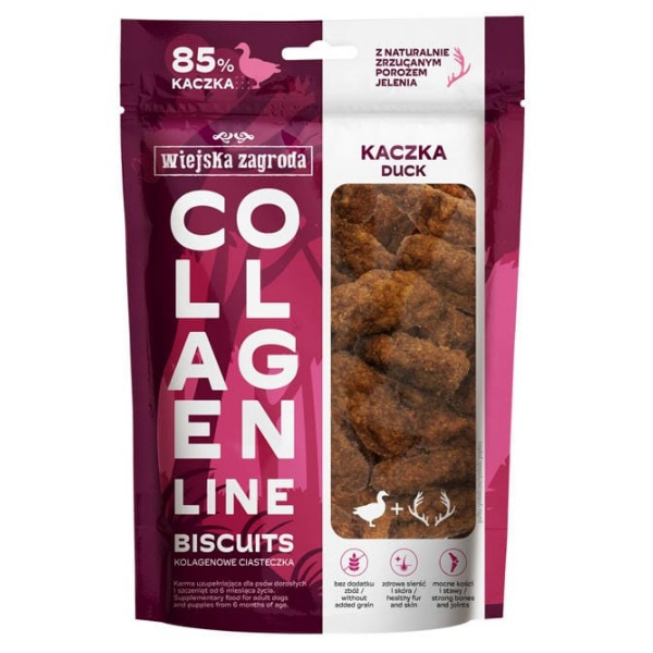 Oferujemy wyjątkowy przysmak dla Twojego czworonożnego przyjaciela - kolagenowe ciasteczka z kaczki od Wiejskiej Zagrody! Te smaczne, zdrowe przekąski zostały stworzone z myślą o psach w każdym wieku i zapewniają nie tylko doskonały smak, ale także szereg korzyści zdrowotnych.