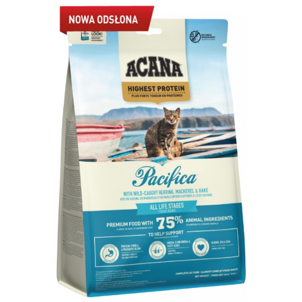 Karma Acana Pacifica Cat jest dostosowana do potrzeb kotów w każdym wieku. Należy podawać ją w odpowiedniej dla kota porcji, a także zapewnić dostęp do świeżej wody.