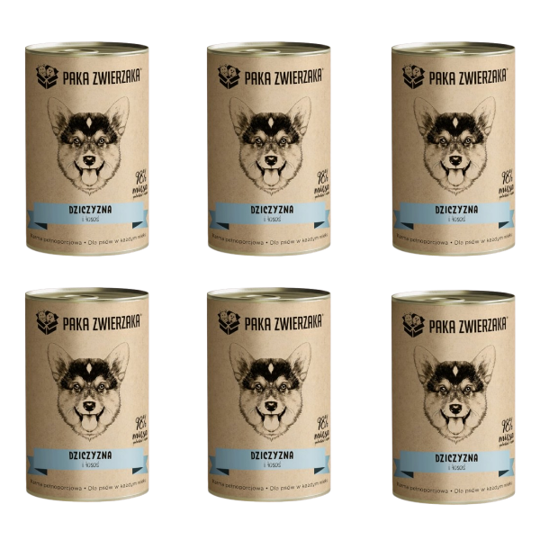 Karma Paka zwierzaka to kompletny i zbilansowany posiłek mokry bez zbóż, konserwantów, sztucznych barwników i wypełniaczy. Nadaje się dla psów wszystkich ras i każdym wieku. Naturalny, bogaty w składniki odżywcze i wysoko przyswajalne źródła białka zwierzęcego skład, przygotowany jest z najwyższej jakości świeżego mięsa i podrobów. Zawiera 98% dziczyzny z rosołem i łososia, co zapewnia wysokie walory smakowe, oraz strawność na równie wysokim poziomie. Paka zwierzaka zadowoli nawet wybredne psy. W składzie znajdziemy nowozelandzką małże zieloną, cenny składnik z właściwościami prozdrowotnymi. Małża ta bogata jest w glukozaminę i chondroitynę potrzebne dla wzmocnienia stawów.